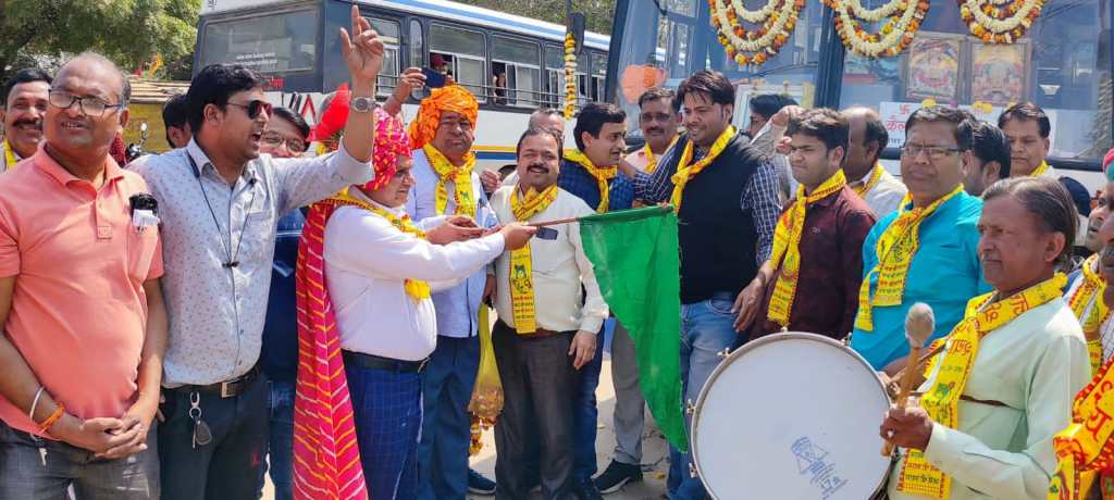 Hindaun City । Fulfilling the long-standing demand of the residents of Rajasthan Transport Corporation to run buses for Khatu Dham, Hindaun Agar Manager, Gajanand Jangid, on Wednesday left the first bus for Khatu Dham. On this occasion, Shyam lovers presented the picture of Khatu Shyam Bhagwan by wearing safa garland and body clothes to the employees of Hindaun Aagar including the driver, operator of the bus going to Khatu Dham, along with the Hindaun Aagar Manager. Many devotees including Deendayal Singhal, Pradeep Garg, Kapil Sharma, Umesh Gupta, Shyam Bansal, Mahesh Kirwada, Pappu Sagai, Rahul Bansal, Naman Jain, Tushar Mangal, Aman Garg, Shailesh Gupta, Atul Vaidhi were present on the occasion. During this, there was an atmosphere of celebration at the roadways bus stand. On this occasion, Dheeraj Tiwari of Hindaun Agar said that on the demand of devotees going to Khatu Dham, this bus has been duly operated on Wednesday and today 21 passengers going from Hindaun City to Khatu Dham have made their first journey.